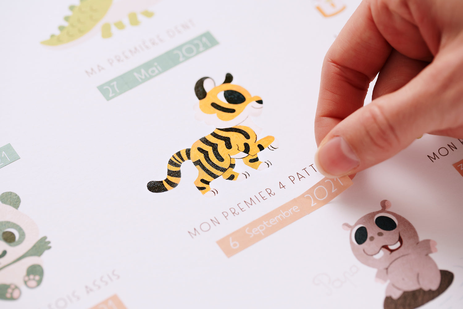 Grâce à ses planches autocollantes, vous pourrez indiquer les petites dates des premières fois de votre bébé.