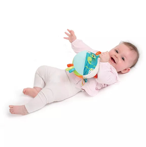 Cette balle d’éveil Caméléon est riche en textures douces et propose de multiples activités, incluant du papier froissé et de petits rubans pour captiver l’attention de bébé.