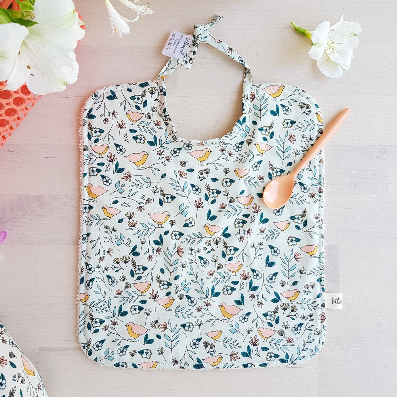 Le bavoir Oisillons de Bilboquet est idéal dès que bébé commence à manger à la cuillère. Sa grande dimension couvre largement nos bambins et protègera ses vêtements pendant les repas. Facile à nouer grâce à deux petits liens, le bavoir Oisillons s'ajustera ainsi facilement au cou de votre enfant.